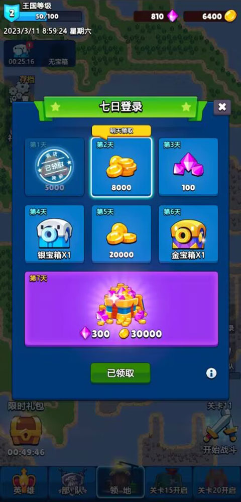 2、但在此之前,可以先把一些免费的福利领到手,之后开启自动战斗就可以快速的去刷关卡和副本了。