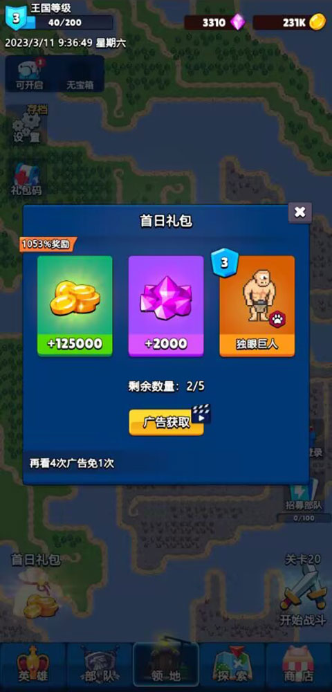 3、45级关卡解锁英雄试炼:尽量挑当天能达到的最高难度打,失败不扣次数。