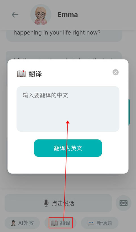 如果用户在对话的过程中不知道中文的英文是什么,就可以点击下方的翻译将中文直接翻译为英文。
