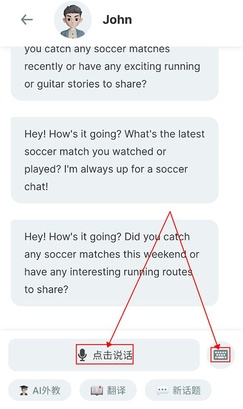 用户在进入对话界面后,可以直接点击话筒进行说话交流,也可以使用键盘打字交流,小编建议使用话筒,可以更进一步的提高口语能力。