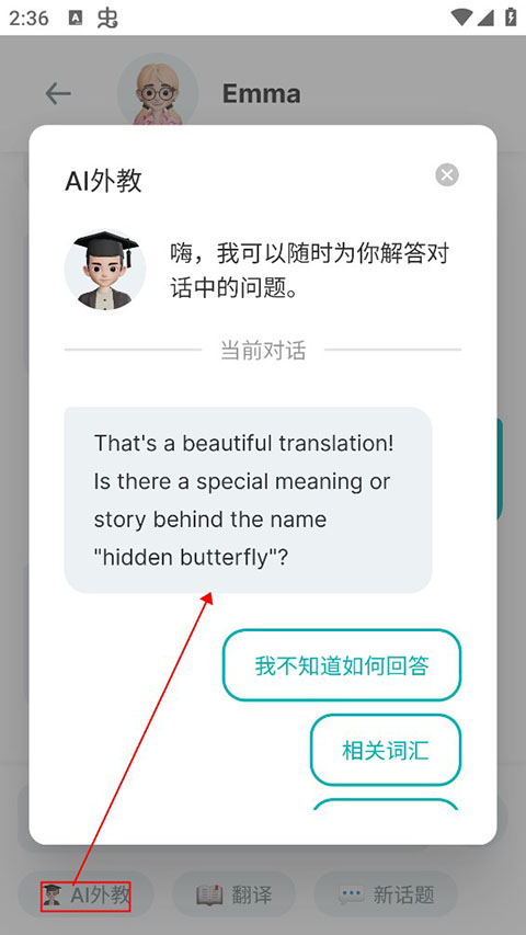 用户在对话页面可以点击左下角的AI外教,它可以解决用户在口语交流对话中的一些问题,还可以帮用户解释对话中的相关词汇意思。