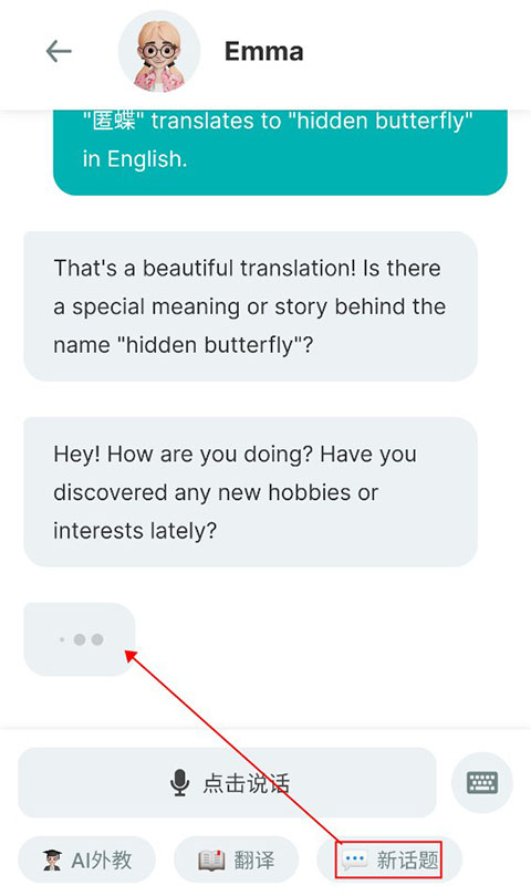 如果用户和AI角色不想聊这个话题了,也可以点击下方的新话题,如果AI就会自动生成一个新话题和用户交流,让用户新鲜感不断。