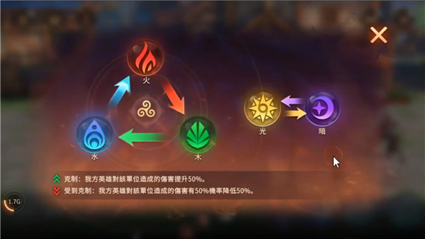4、游戏中的英雄角色按照不同元素属性分成了五大类,每种元素属性之间有存在的一定的氪制关係,具体的克制关係为“水元素”克制“火元素”,“火元素”克制“木元素”,“木元素”克制“水元素”,而另两种“光元素”与“暗元素”属性之间为互相克制关係。