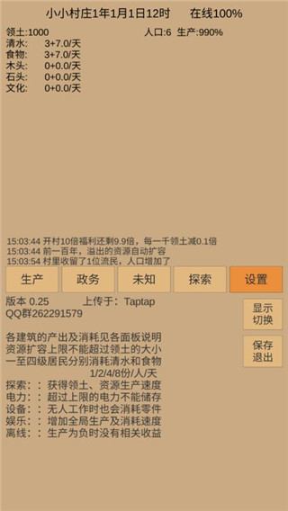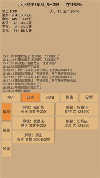小小村庄是一款文字叙述类型的放置挂机游戏,在这里你需要对村庄里的建筑进行合理分配,扩建家园,吸引更多村民前来居住,并进行合理分工,包括探索、采石场、水井、农田、伐木场等。玩家前期需要不断的收集资源,在保证整个村庄正常运行的同时,增减更多的基础设施以及生活装置,作为一村之长,为了让你的村庄变得越来越好,越来越完善,需要不断解锁各种设施,等级提升之后,是可以解锁铁矿场、狩猎场、武器店、防具店等资源,然后还能外出探索,获得一些比较稀有的资源。