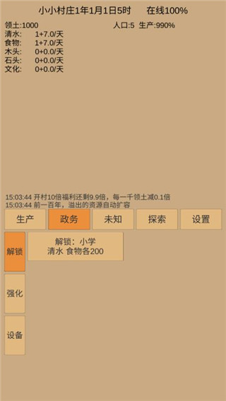6、点击政务,可以解锁小学,这个解锁是有条件的,需要清水以及食物个200。