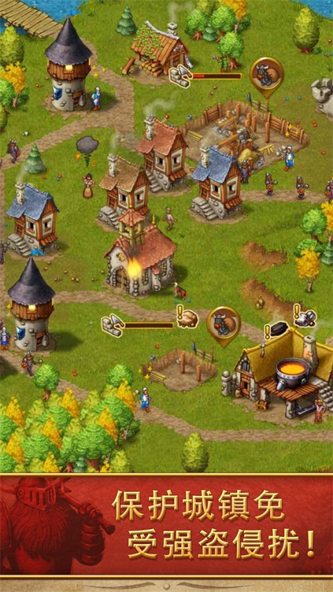 家园高级版(Townsmen)是一款中世纪建造经营手游,玩家将从零开始开垦荒野,逐步将一个小乡村建设成梦幻中世纪帝国。玩家需要精心规划布局,建设房屋、农场、伐木场、炼金厂等基础设施,打造完整的衣食住行产业链,提升居民幸福度。除了生产建设,玩家还需建造兵营和守卫塔,招募勇敢的士兵守卫村庄,抵御土匪的袭击,保障村民的安全。