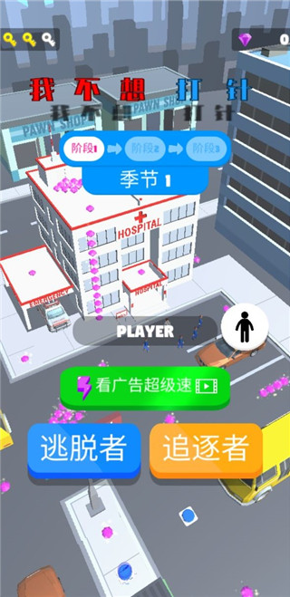 我不想打针最新版是一款休闲跑酷游戏,游戏采用卡通画风,画面精致,玩法简单,在这里玩家可以选择逃脱者亦或是追逐者,如果选择逃脱者玩家将会作为一名患者,会有医生一直追你让你打针,你要快速的进行逃脱,不要让他追上你,不要就会被打针,任务失败,在此期间,玩家可以使用游戏中的道具帮助快速逃脱,同时还可以拾取路上的钻石和钥匙。如果选择玩追逐者,玩家将会化身成医生,需要追到患者给他们打针,在规定时间中将患者都打上针就可以获得游戏的胜利。总之,我不想打针最新版是一款十分经典且富有特色的闯关类型的游戏,其中采用了非常简约的玩法来进行的,玩家可以通过去完成更多不同的挑战来进行游戏,能够带给玩家更多的体验。,喜欢的玩家还在等什么,快来下载体验一下试试看吧!