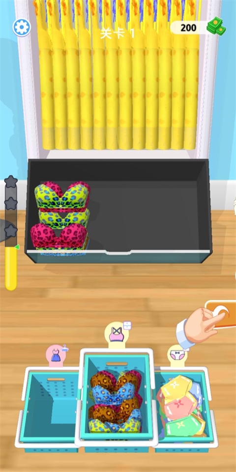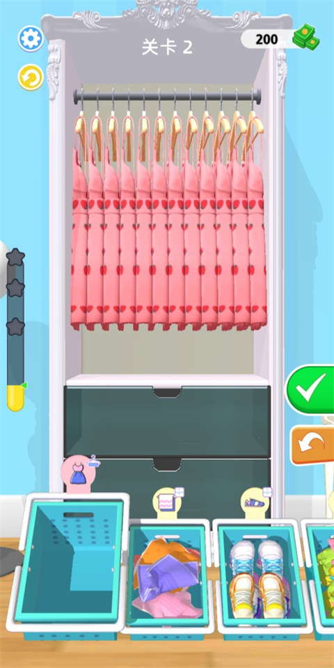 游戏关卡设定在不同的橱柜中,每个橱柜都有大小不一的格子。从最基础的双层橱柜开始,逐渐增加难度,物品种类也变得更多样化。你需要分类整理上衣、裙子、内衣、毛巾、鞋子等等,展现自己的收纳天赋。