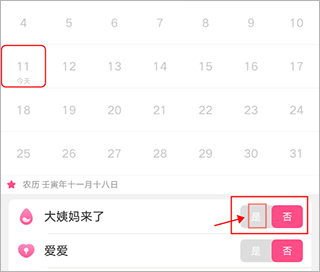 2、接着在日历中选择经期开始日,然后点击下方的“大姨妈来了”中的“是”。