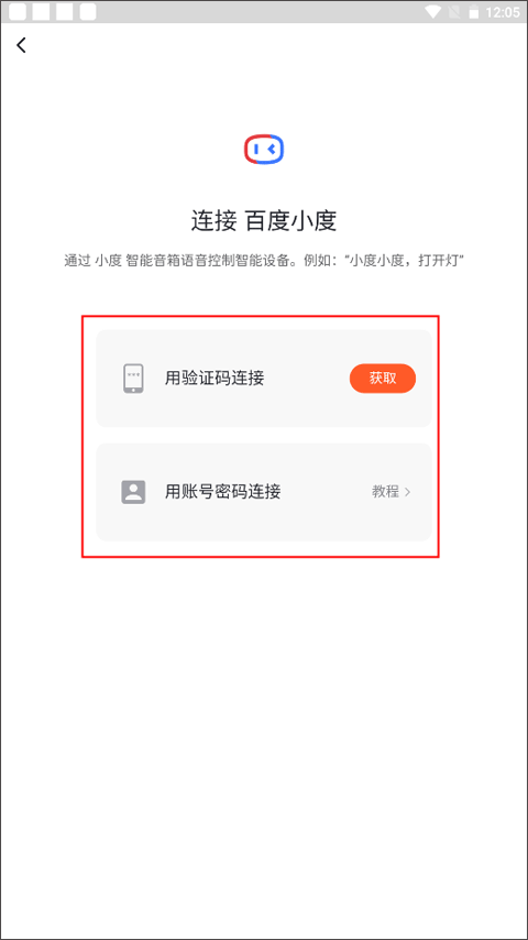 2、选择连接小度,进入到设备连接界面,有两种连接方式:用验证码和用账号密码连接。