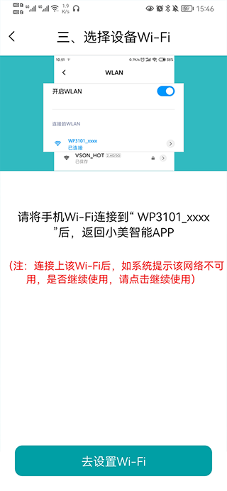 四、将手机WiFi连接到wp3101_xxxx后,就可以连接设备了