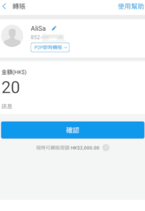 拣选转账对象/输入对方的电话号码或AlipayHK账号或银行账户