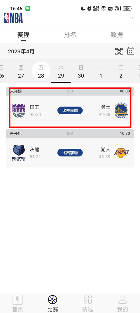 2、点击比赛来到赛程页面,在赛程页面找到你想要看的球队比赛日期;
