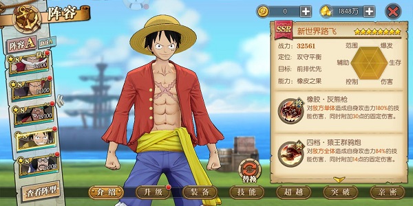 进入游戏注册名字每个玩家的角色都是品质为SR的路飞。可以通过超越来提升角色星级,前期建议争取以最快的速度进入游戏,根据教学提示做完提示任务!第一时间提升等级解锁竞技场功能,一开始竞技场全是NPC大家可以轻松提升排名,刷竞技场主要是为了拿声望,声望可以兑换角色碎片以及精炼石、秘传书等等道具,前期在角色升级方面十分有用。竞技排名前几百名的声望商店里面还有高级的秘传书和英雄之石等道具,前期获得的资源越多,竞技场的排名也会上升的越快,也能更快的获得竞技场里面的强力道具。
