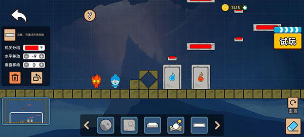 2、液体面积过大,角色无法通过时,寻找机关、石块,控制与液体同色的角色推动石块,在液体中铺路,让另一个冰火人通过。