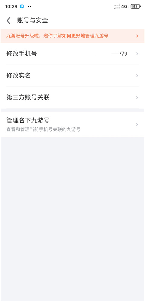3、进入账号与安全,拥有修改手机号、修改实名、账号关联等功能,点击管理名下九游号,可以查看和管理当前手机号关联的九游号