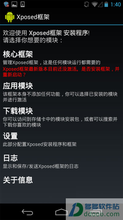 您是否经历过,手机软件下载过来是用不了的情况呢?是的,现在有很多软件都是需要某种软件的支持才能够正常运行的,比如说:Per APP Setting、Cydia、XPrivacy、Launcher等等软件都是需要一款名为:xposed框架支持使用的!如果您在安装软件时,也出现了如此问题,不放尝试一下这款框架,定会给你方便的使用过程!另外,小编在此提供的是xposed框架中文版,由于是官方推出的是英文版,所以导致很多用户在使用方面都遇到了非常大的语言问题,所以才想广大用户提供下载!最后,告诉大家一个小秘密,xposed框架还能够对手机中的模块进行修改哦,让你自己DIY手机模块,让这些模块成为独一无二的。
