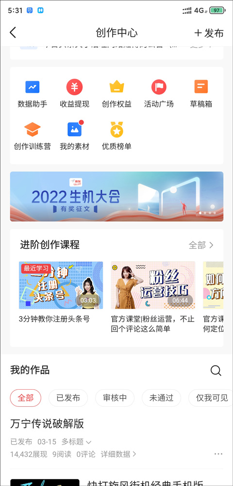 1、在今日头条我的里面,点击创作中心后面的进入,在创作者页面点击右上角的发布。