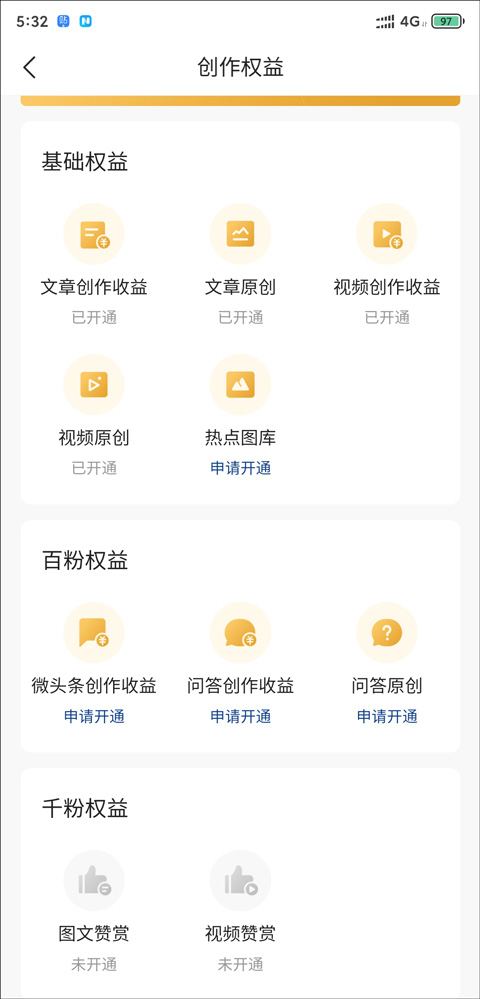 3、拥有基础权益、百粉、千粉、千份、万粉等权益,刚开通账号只能进行最基础的权益开通