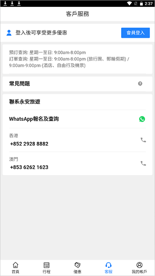 永安旅遊app官方版(大陆用户也称之为:永安旅游)是一款香港本土知名的提供专业及称心的旅游度假服务应用,也是大陆用户出境旅游的热门应用之一。通过该应用用户可即时预订全球200多个城市的机票,超过40万间酒店及多间廉价航空机票任您选择,更提供香港往返澳门﹑蛇口﹑广州等地之船票,让您即时预订。同时用户在登录应用后即可成为永安旅遊官方会员用户,享受更多会员优惠活动,并可进行积分兑现,让你省钱省心地完成出境旅游。另外应用可以一站式预订各景点门票,并获得快速入场的二维码电子门票,让用户们无论是餐饮券、交通、WiFi上网、亲子游活动等都可以一站式解决,有需要的用户可以在本站免费下载使用。