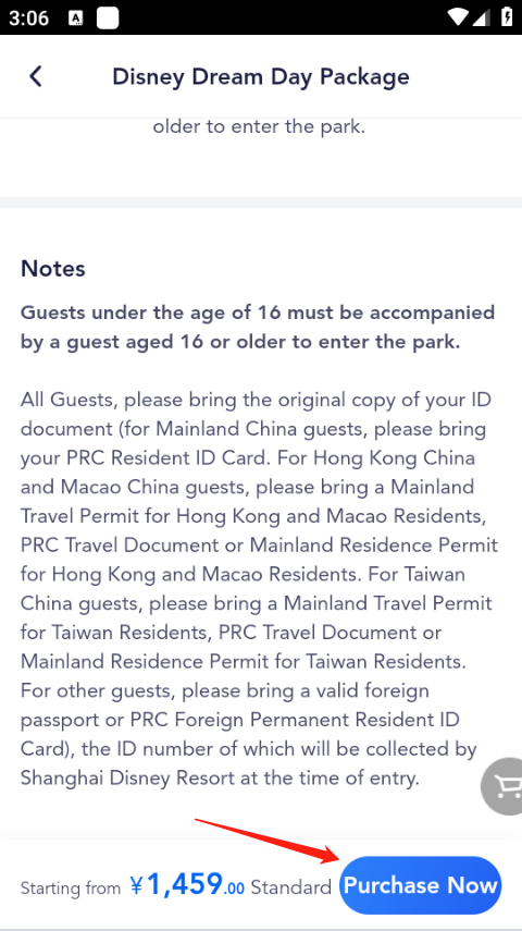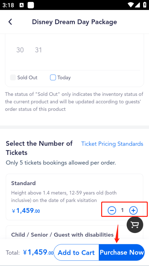 5、然后选择确定好时间日期,往下滑,添加购票的数量,点击Purchase Now,立即购买,付完款之后门票就预定完成啦。