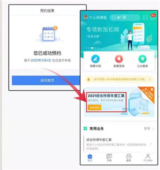 5、提交成功后,系统显示“您已成功预约”页面,纳税人即可在预约日期当天办理2021年度汇算申报。此外,还可以在手机个人所得税APP首页年度汇算专题栏查看预约情况。