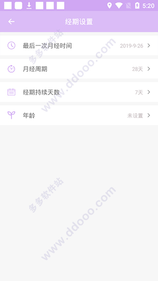 选择经期设置,然后即可自定义设置详细的经期,例如最后一期月经时间、月经周期、经期持续天数、年龄等。