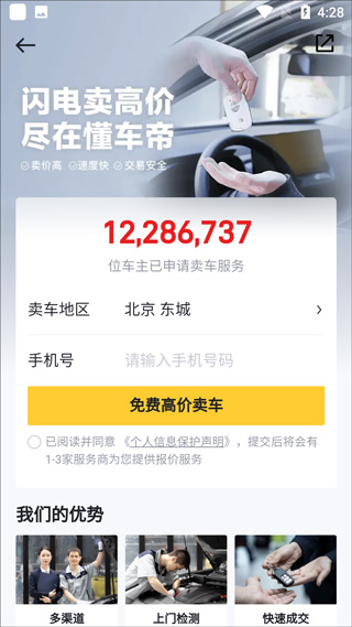 4、点击“高价卖车”,输入你的信息,点击高价卖车,提交后会为您提供报价看车服务
