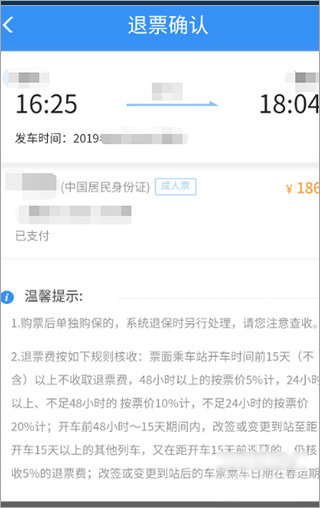 4、点确认之后会进入到退票确认页面,会告知你一些关于车次的信息,还有发车的间隔时间;