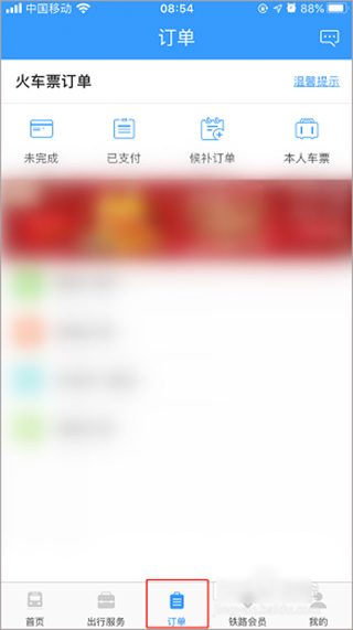 1、首先在手机上打开12306应用,然后在底部的导航栏上点“订单”,进入到订单页面;