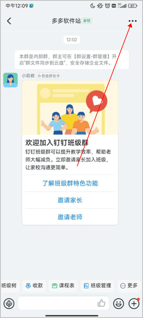 1、进入钉钉首页,然后选择需要查看直播回放的群聊,进入之后,点击右上角的三点。