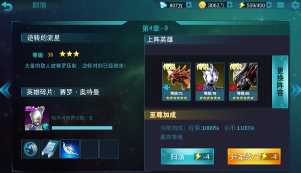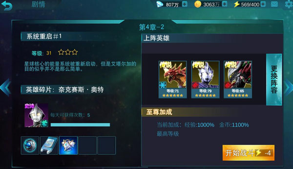 《奥特曼传奇英雄》第四章副本已经有不小的难度了,不少新手网友可能都会遇到打不过情况,这个时候就需要提升战斗力并搭配变身器技能才能够成功。