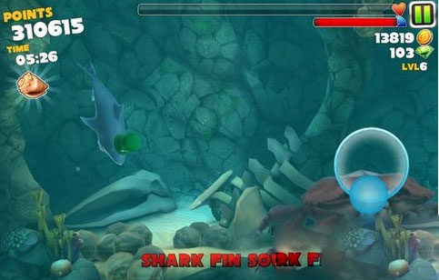 游戏中我们可以通过一只手控制它前进的方向,同时在按住屏幕,鲨鱼就会加速前进,这样就可以吃到更多的鱼了。右上角绿条是你的饥饿度,当他没有的时候,你就会GG,红色代表的是你的咬力,这对我们无关紧要,旁边的按键是暂停键,以供我们有事的时候可以保持状态,右边显示的是我们的金币和砖石,左边有分数,贝壳是人物,但是必须收集游戏里的贝壳来解锁相对应的任务,中间下边的黄条是进入淘金热的距离,当黄条满了,就进入淘金热,在这个状态下我们是无敌的而且吃到的所有生物都是金币,非常爽,游戏中吞食人类的画面比较血腥,我就不截图了。