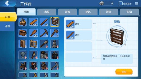爬梯的制作非常简单,在工作台和背包的合成栏里都可制作,仅需要砍伐树木所获得的木块的合成物——木板*1和木杆*2即可。