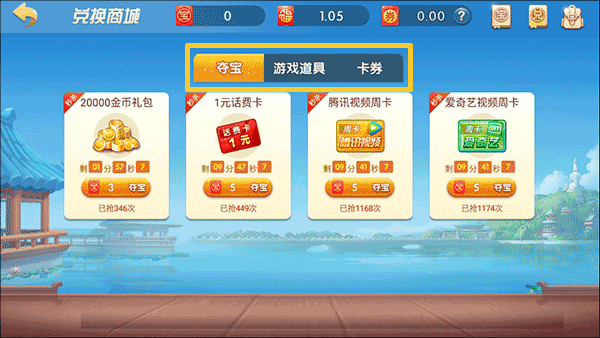 3、在这里玩家还可以对夺宝、游戏道具和卡券进行兑换。