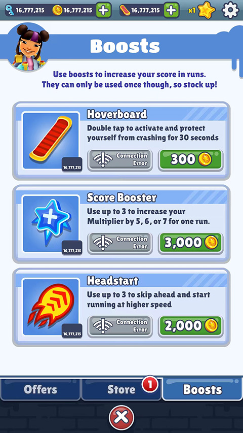 常见道具有:火箭推进背包,该道具可以让角色飞起来一段距离并沿路收集金币;超级运动鞋可提升角色正常情况的下的奔跑速度;金币磁铁可将帮助角色收集附近范围内的所有金币;双倍积分可让一定时间内获得的积分*2,以上这些道具都是有持续时间的限制,所以使用时一定要把握好时机,将收益最大化。