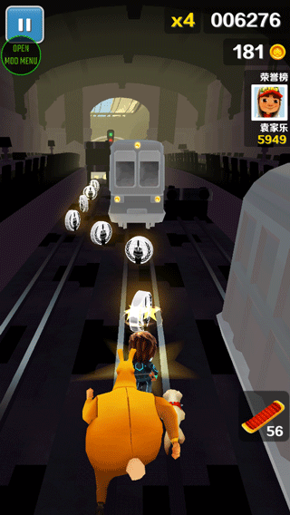 1、地铁跑酷灰烬EURFEBRIGHT版本游戏开始保安和他的狗会在后面追赶你,你不能失误,如果撞上障碍物就会被抓住