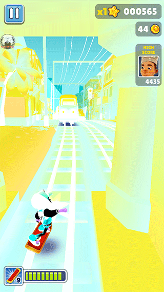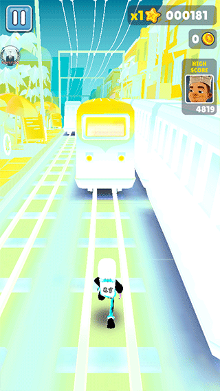双击屏幕可启动滑板道具,如果在没有启动滑板功能的情况下,角色撞上障碍物或者火车游戏就会结束,而在滑板状态下,等于给角色买了保险,滑板会在撞到障碍物时消失,但游戏可以继续进行。滑板在消失后的几秒内出现冷却时间,当闪烁结束后可通过双击再次启动,没有次数的限制。