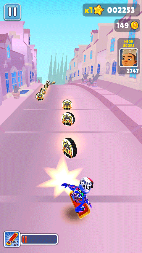 游戏中有主动道具和拾取道具,拾取的道具就是在途中随机刷新的道具,每种都有不一样的作用,而主动道具就是滑板,通过双击屏幕使用,可以为你抵挡一次撞击。