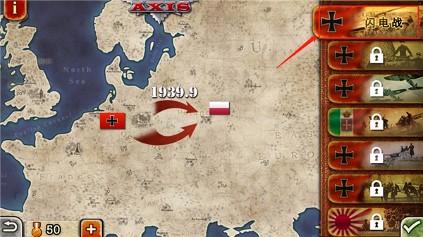 10、触摸我方部队所在的地区就可以让部队行动了,蓝色箭头指向可以移动的地区,红色箭头指向和敌军交战的地区。