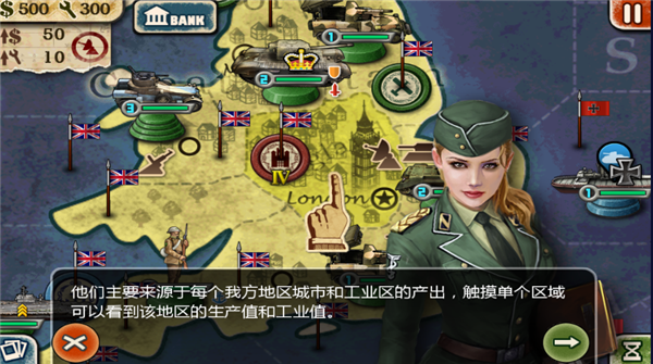3、他们主要来源于每个我方地区城市和工业区的产出,触摸单个区域可以看到该地区的生产值和工业值。我方部队区域是用坦克、战舰等图标展示的,十分明显,触摸部队区域,蓝色箭头指向可以移动的地区,红色箭头指向和敌军交战的地区。