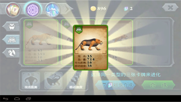 2、接着点击上面多面体紫球,进行合成,左边三个选项卡是三个属性分类,第一个是直立行走的动物,第二个是爬行动物,第三个是飞行动物,因为每次合成至少要三个动物,并且这三个动物必须属于同一种类型,所以我们先来合成老虎犀牛老虎。