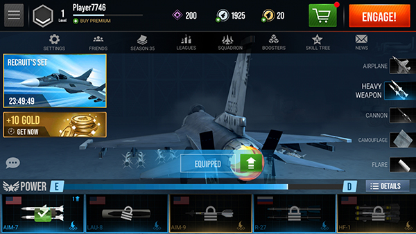 2、装备好自己的战机后,选择右上角【ENGAGE】选项,