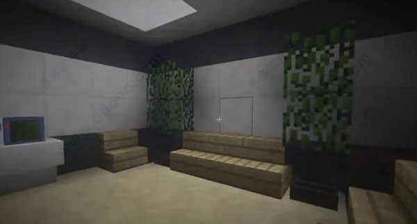 在另一边还要给我们的口袋妖怪玩家做一个电脑, 再用铁砧和橡树树叶做一些绿化, 当然还有凳子 ,可以用桦木楼梯。