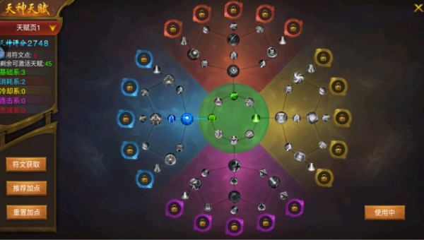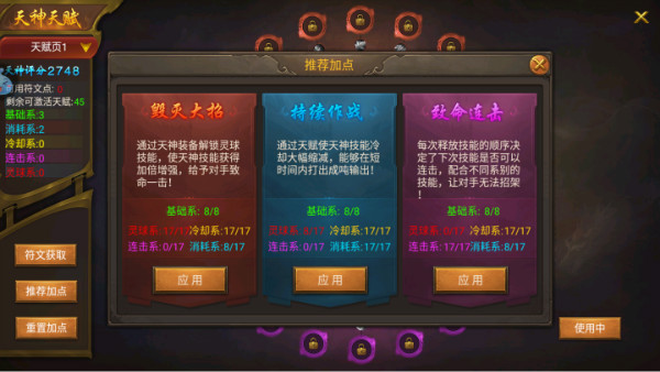 2、点击角色左下角的图标可以进入天神天赋页面,觉得眼花缭乱吗,不要怕,左边有三种类型的推荐加点,你也可以选择自己加点构建自身的独特玩法哦,每次重置加点都是免费的,所以慢慢摸索属于你的最强天赋搭配吧。