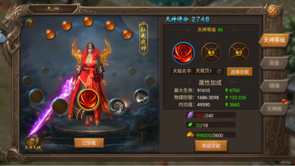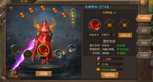 1、在天神等级页签,可查看自身天神等级,随着等级的提升,玩家会有自身属性的加成,并且在等级页签,你可以自由搭配自身的天神技能和天神天赋,升级材料可以通过天神殿闯关和扫荡免费获得哦。