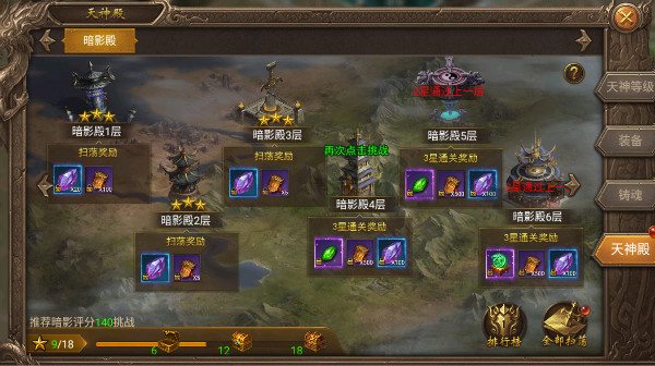在天神殿你需要进行闯关,闯关可以获得免费的升级材料,奖励分为闯关奖励和扫荡奖励,闯关是一次性拿到的奖励,扫荡是每天都可以获得的奖励,闯关越多,扫荡获得的奖励越多。每天上线先闯关,打不动之后使用全部扫荡,这样就可以获得最多材料了,闯关星级达到一定数量还可以在下方进度条免费拿更多的材料哦,每天都要记得扫荡哦,这是免费获得材料的方法。