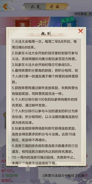 小技巧:若是区里比较和谐,大家都在一起聊天,那么自己和别人是什么阵营,在斗法开始后就会知晓的。只需要有人组织下,在规定时间内指定一方的阵营把自己实力降一下(下了黄龙招式、换了低级装备、换了坐骑),让另一方的打。这样2方的互相打下,连胜的几率会大很多,可以拿到更多的斗法佩。例如:晚上6点-7点,鸿蒙方降实力,让混沌方打;晚上7点-8点,混沌方降实力,让鸿蒙方打。
