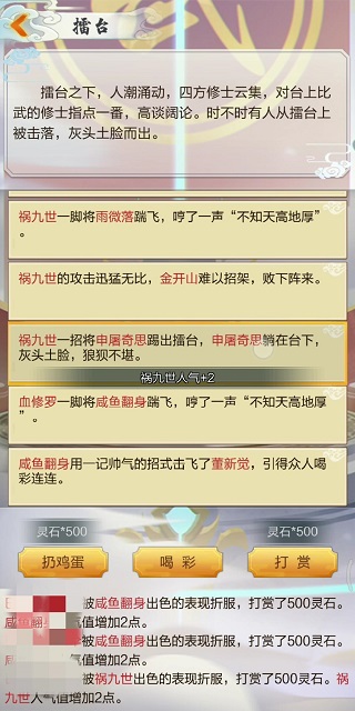 3、其他增加人气的方法。除了连胜,打赏和喝彩也可以增加人气,当然扔鸡蛋可以给别人减人气(强烈不推荐这种损人利己的行为,修仙修心,不要为了一点点小利就损害他人的利益)。一个号,每天可以打赏5次(免费不花钱的)、喝彩5次(每次500灵石)、扔鸡蛋5次(每次500灵石);1次打赏+2人气,1次扔鸡蛋-2人气,1次喝彩+1人气。