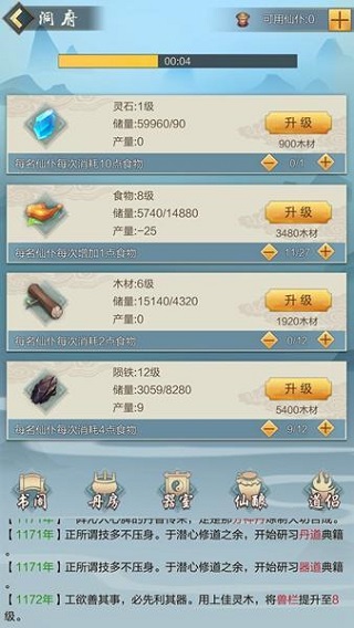 新手第三件事情合理安排洞府资源,洞府可以生产灵石、食物、木材和陨铁,灵石因为消耗资源过多,不建议升级和生产,食物是生产其他几个材料所必须的消耗品,因为每安排一个产量都需要仙仆,仙仆消耗食物。这里有个小建议去网上找一些礼包用用,可以赠送不少洞府材料。洞府资源优先升级食物,之后使用食物购买仙仆,然后升级木材,因为木材是升级其他生产线等级必须物品,最后才是陨铁,陨铁也是目前消耗最少的。在安排好洞府资源的同时再去提升灵池。